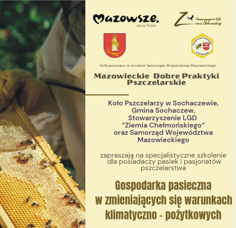 Samorząd Województwa Mazowieckiego w Warszawie Stowarzyszenie Lokalna Grupa Działania „ZIEMIA CHEŁMOŃSKIEGO” oraz Koło Pszczelarzy Powiatu Sochaczewskiego zapraszają na specjalistyczne szkolenie dla posiadaczy pasiek i pasjonatów pszczelarstwa w ramach MAZOWIECKICH DOBRYCH...