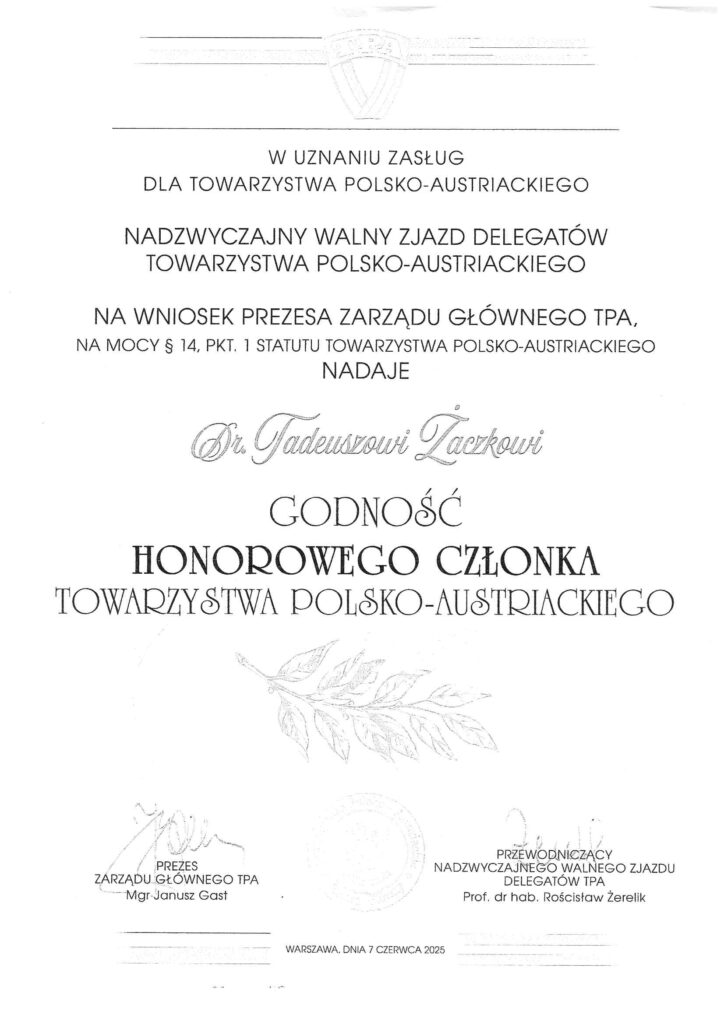 W dniu 7 czerwca 2025 r. w Narodowym Instytucie Kultury i Dziedzictwa Wsi w Warszawie odbył się Nadzwyczajny Walny Zjazd Delegatów Towarzystwa Polsko-Austriackiego. Na wniosek Prezesa Zarządu Głównego TPA Janusza Gasta Walne Zgromadzenie Delegatów nadało Godność Członka Honorowego TPA m.in. dr. Tadeuszowi Żaczkowi – wiceprezesowi Zarządu Głównego Towarzystwa Polsko-Austriackiego.