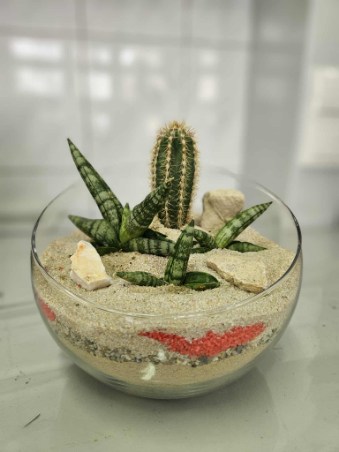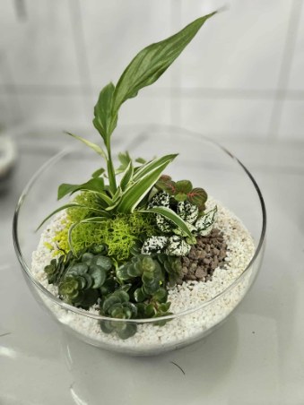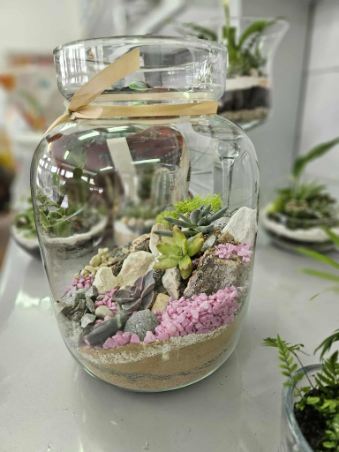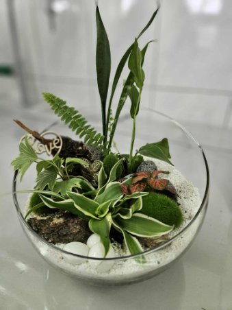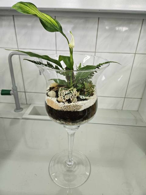 Florystyczne dzieła ukazują już tęsknotę za upragnioną wiosną i słońcem. Ogródek w szkle to efektowna, samoobsługowa kompozycja roślinna w szklanym naczyniu. Najlepsze rośliny to fitonia, bluszcz, paproć, skrzydłokwiat, pilea. Wymaga warstwy drenażu, węgla aktywnego, wilgotnego podłoża. Takie i inne kompozycje wykonali floryści i florystki pod okiem p. Wioletty Domańskiej.