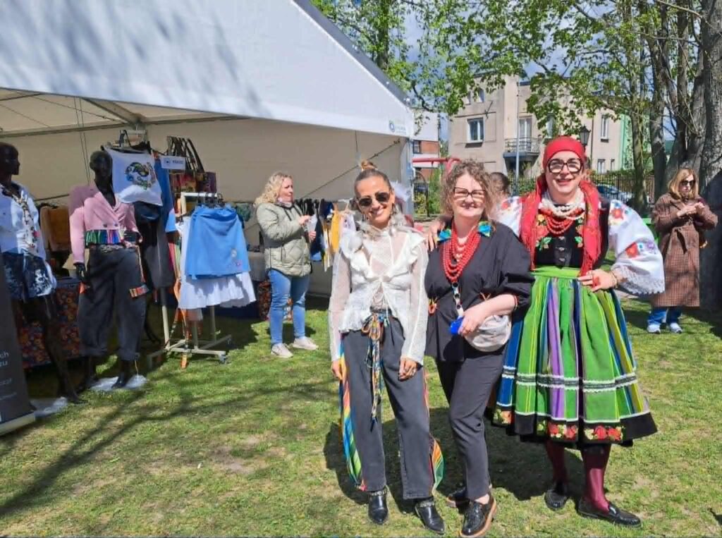 Słuchaczki kkz krawiec, pod okiem nauczycielki mistrzyni Izabeli Dańczak, zaproponowały fantastyczną stylizację łączącą dżinsowe spodnie z elementami stroju regionalnego, łowickimi pasiakami. A wszystko to podczas wydarzenia „Łowicka szafa”, w parku przy zabytkowej Baszcie, które uświetniła swoją obecnością Jola Czaja – stylistka gwiazd.